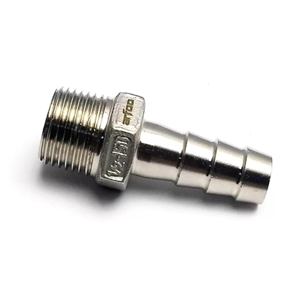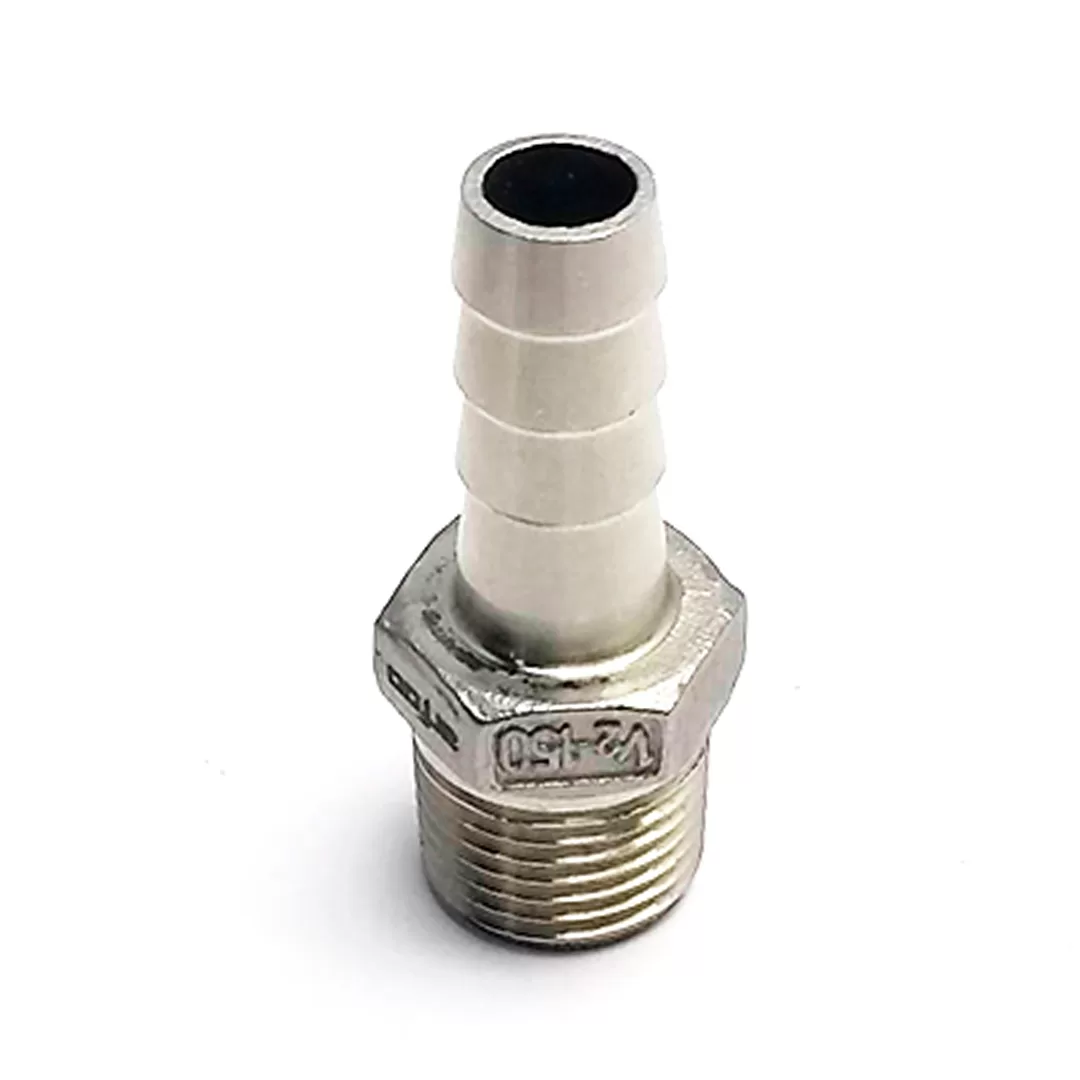- Rosca macho 1/2” NPT x Espigão de 1/2” em aço inox, para tubos e mangueiras.